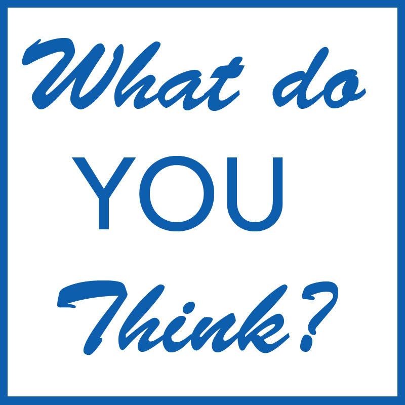 What do you think? box with blue around and blue letters, graphic, SI, 700x700